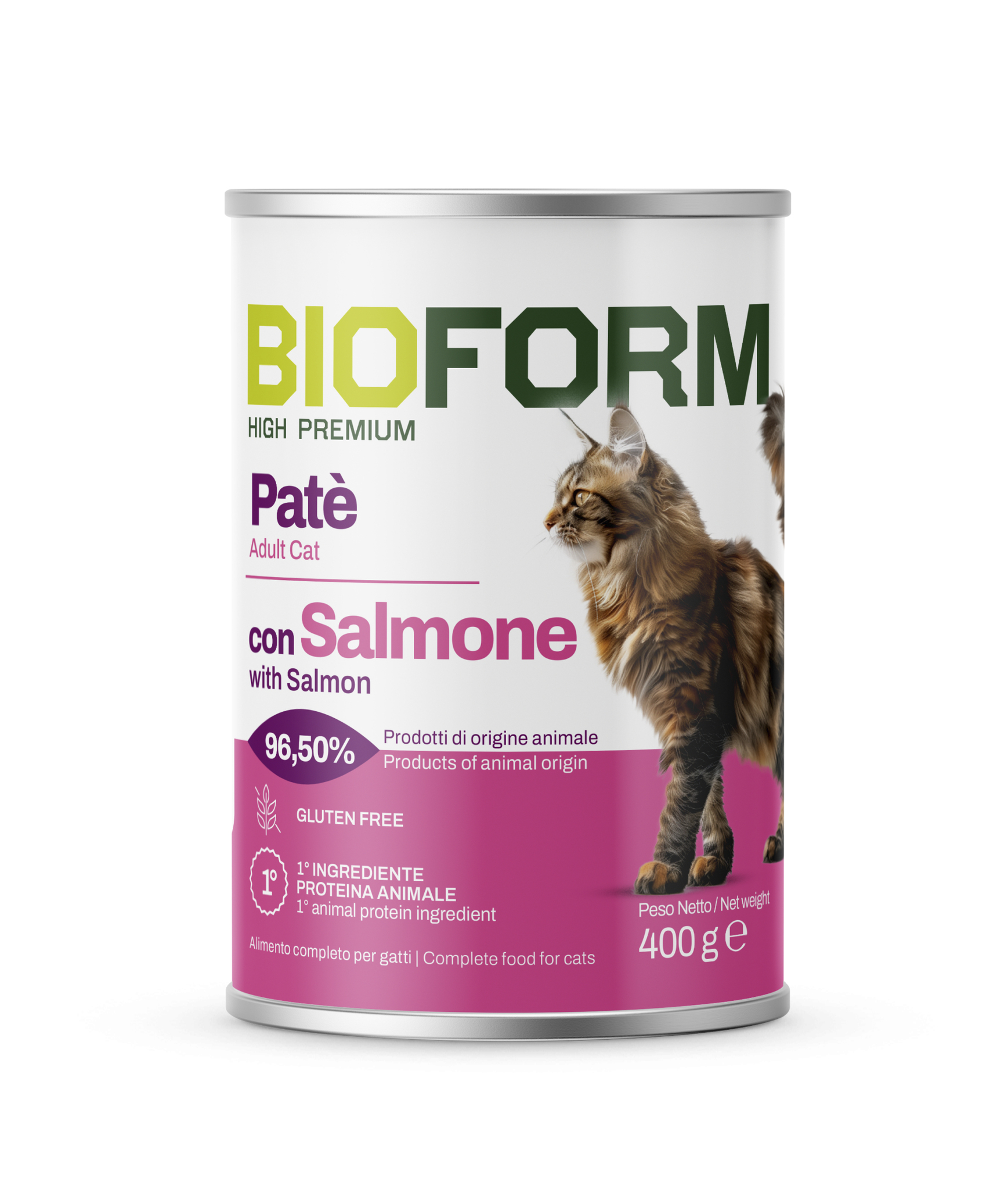 BioForm paštéta z lososa je kompletné vysoko prémiové krmivo pre dospelé mačky všetkých veľkostí. Navrhnuté a vyvinuté pre mačky s priemernou/intenzívnou dennou fyzickou aktivitou. Receptúra Adult All Breeds, obohatená o vitamíny a minerálne soli, predstavuje kompletnú a vyváženú dennú stravu: obsahuje lososa ako vysoko stráviteľný zdroj bielkovín.