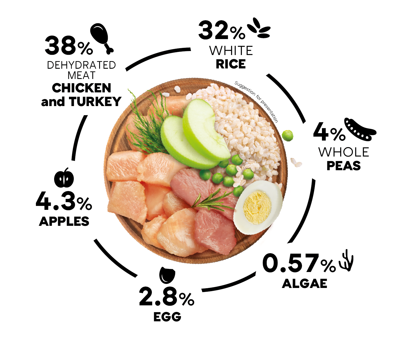 Zloženie: Dehydrované kuracie a morčacie mäso* (38 %), biela ryža* (32 %), kurací a morčací tuk*, celý hrach* (4 %), dehydrovaná repná dužina* (4 %), hydrolyzované kuracie mäso* (3 %), dehydrované vajce* (2,2 %), minerály, pivovarské kvasnice*, dehydrované riasy* (zdroj DHA) (0,57 %), dehydrovaná jablková dužina* (0,5 %) (ekvivalent 4,3 % čerstvých jabĺk), mannán-oligosacharidy MOS* (0,1 %), fruktooligosacharidy FOS* (0,1 %), chondroitín (900 mg/kg), glukozamín (813 mg/kg), drožďový extrakt* (prírodný zdroj nukleotidov): 0,09 %, Yucca schidigera*. *Prírodné zložky.