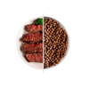 Zloženie: dehydrované mäso 28 % (hovädzina min. 16 %, losos, jahňa), kukurica, obilniny, živočíšny tuk, ryža, repná drť, lososí tuk (3 %), antioxidanty, vitamíny.