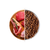 Zloženie: dehydrované mäso 34 % (jahňa min. 16 %, hovädzina, losos), kukurica, obilniny, živočíšny tuk, ryža, repná drť, lososí tuk (3 %), antioxidanty, vitamíny.